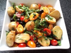 Baby roast potatoes, green beans, cherry tomatoes, black olives with a garlic dressing